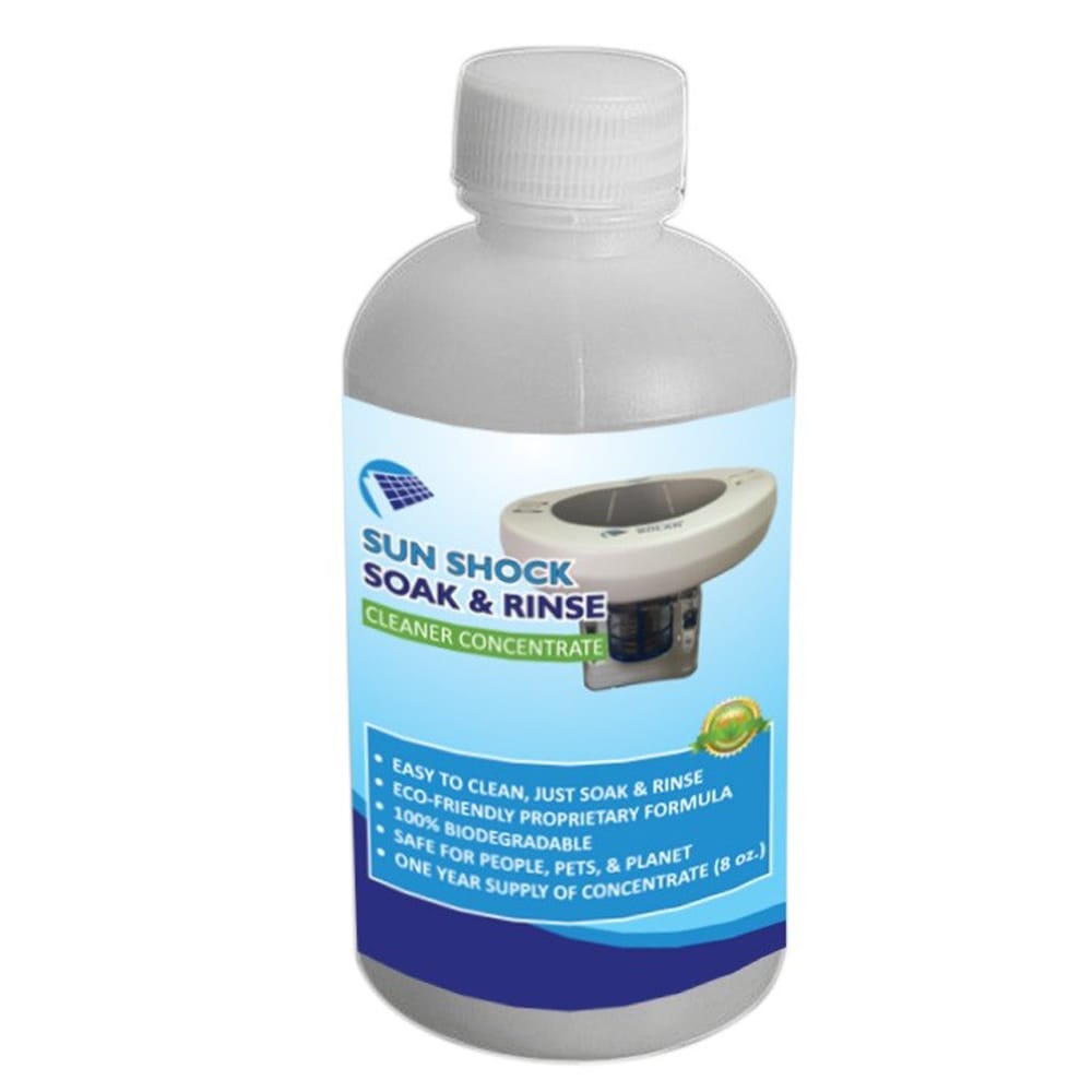 Pour 2-3 ounces of Sun Shock Soak & Rinse TM into a clean glass or plastic jar with a wide opening. (Such as a jelly or peanut butter jar). Fill with water. Place your entire Sun Shock (basket and anode, don’t unscrew the screw on the bottom) and let the entire bottom assembly soak for 8-12 hours. Remove Sun Shock and rinse with a garden hose. Put it back in your swimming pool and let it get back to work. No more dirty hands. No more fumbling with the Sun Shock. Place lid back on jar for future use. One 8 oz bottle of non-toxic concentrate will last one swim season (summer).
